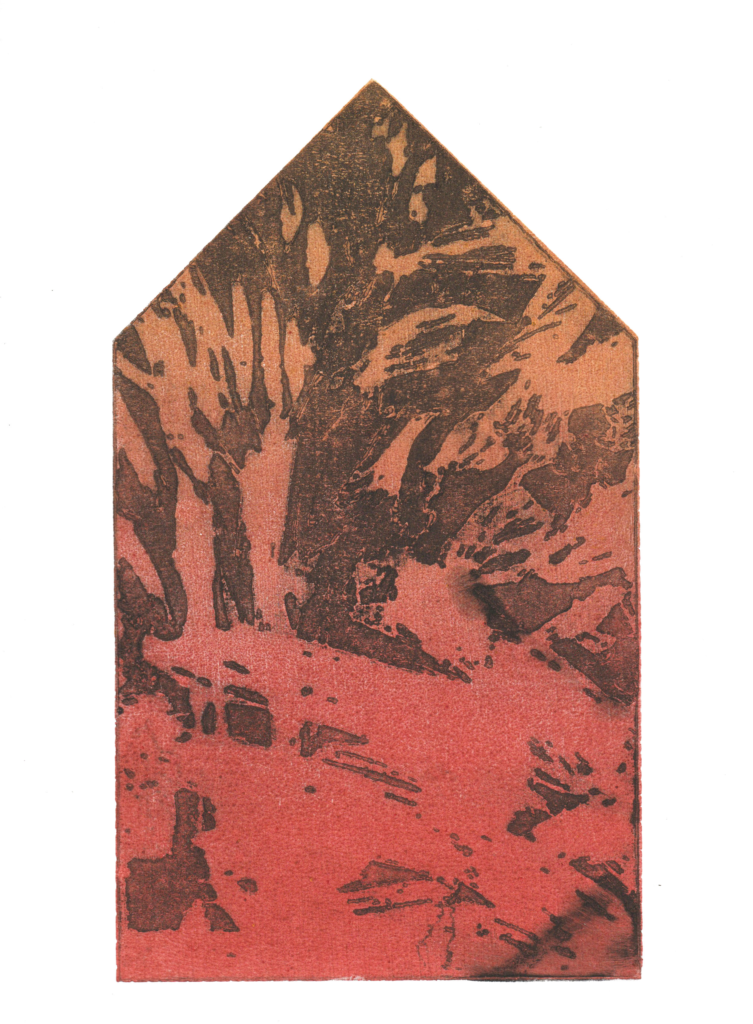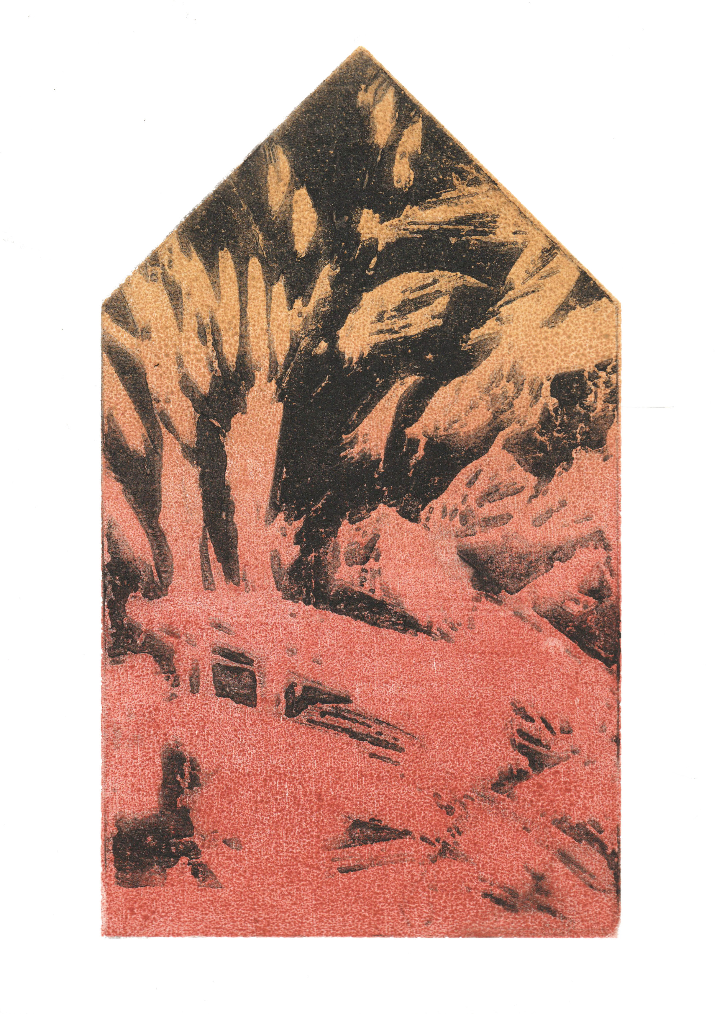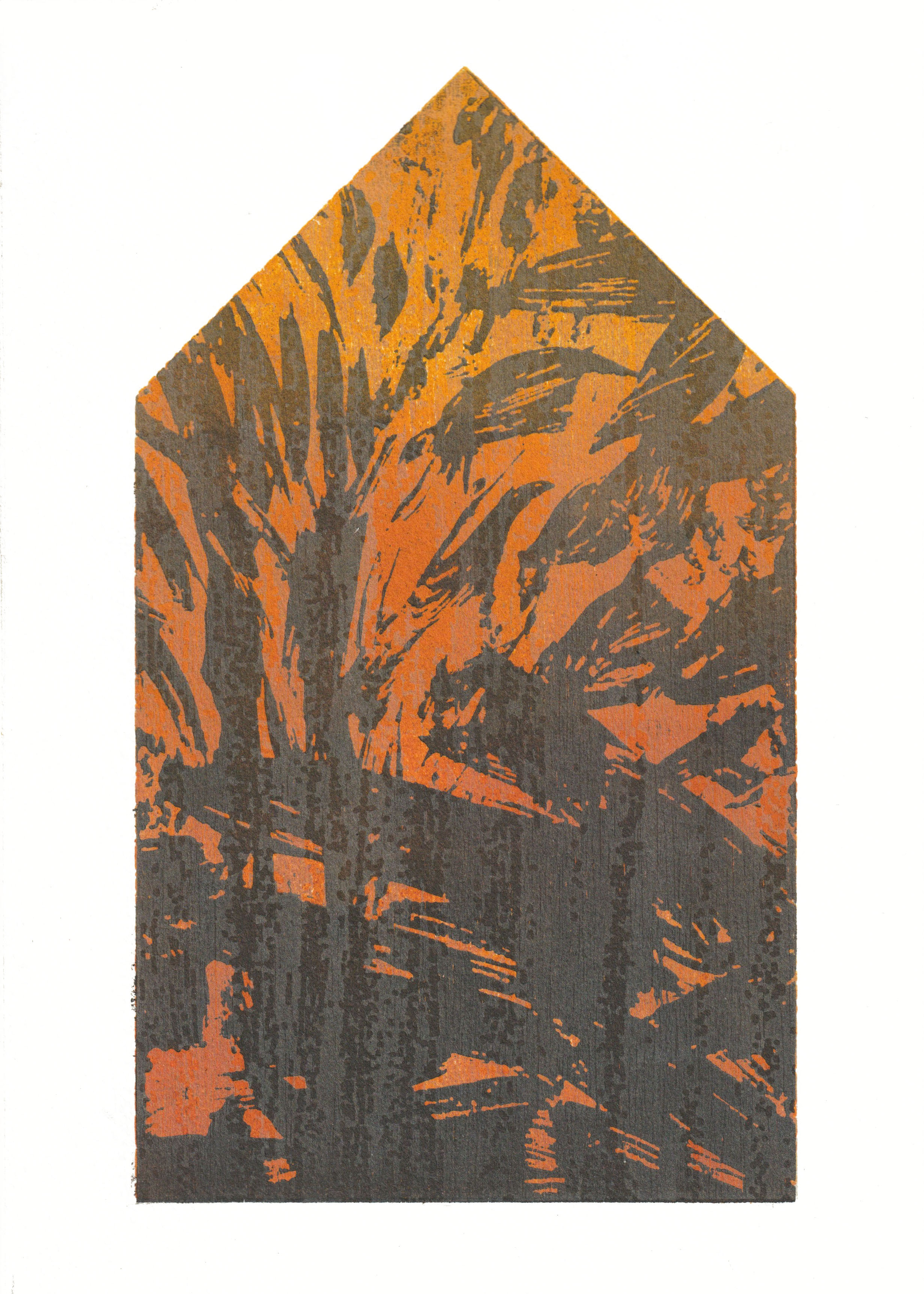 greenhouse, graficzny cykl intermedialny - drzeworyt CNC, grawerowany biomateriał, druk na różnych podłożach, pigmenty naturalne/ intermedia graphic series - CNC woodcut, engraved biomaterial, print on various substrates, natural pigments, 15x26 cm, 2025